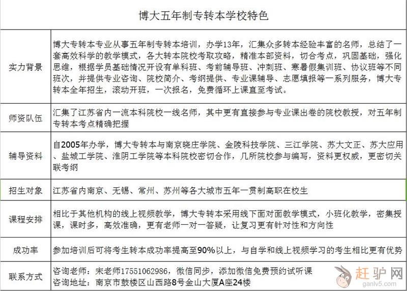 江苏瀚宣博大专转本培训学校是一家专业从事五年制专转本辅导,三年制专转本辅导的培训机构,以其强大的师资力量,精准的内部培训教材和高达90%的通过率闻名,办学13年以来,在江苏省内开办了南京金山总校区、无锡汇金校区、苏州石路校区、常州钟楼校区、南通校区等各大城市分校。江苏博大专转本学校以帮助五年制高职在校生、三年制大专生实现全日制本科梦为宗旨,以保三本冲二本为辅导目标,制定了专业的辅导计划,并有专转本辅导周末班、考前班、冲刺班、寒暑假集训班、考前集训班、签约协议班等不同班次供学员选择,具体招生详情可联系招生老师 一七五五一〇六二九八六 微信同步,地址南京市鼓楼区山西路8号金山大厦A座24楼。