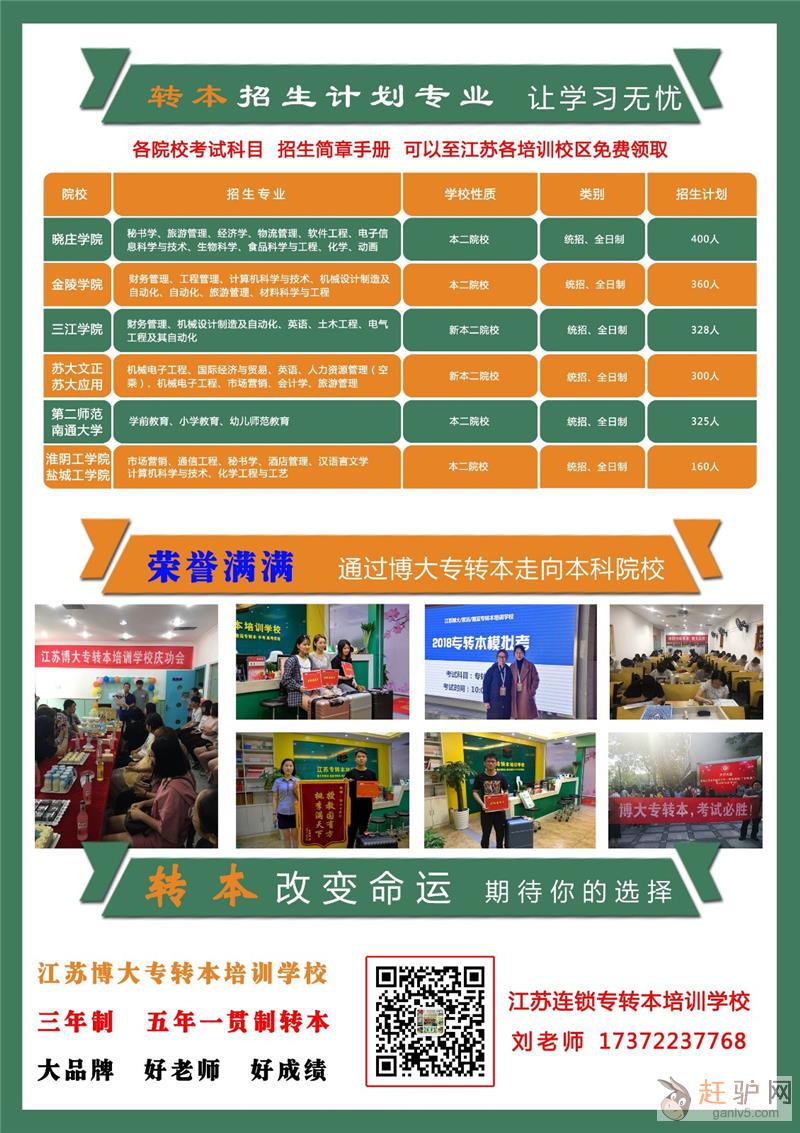 江苏瀚宣博大专转本发展于2005年,十几年只做好一件事五年制专转本(五年一贯制专转本)培训辅导,拥有1流的师资,精准的内部学习材料,历年英语真题卷、模拟卷、押ti卷,专业课试卷集、习题册,提升学员应试技巧和解题能力,让考生在备考路上占据极大优势!江苏瀚宣博大五年制专转本学校更为学员提供专业咨询、院校介绍、英语辅导、考纲提供、专业课教学、统一报名、集体送考等一系列流程化服务,让考生对五年一贯制专转本的了解更加深入,更加有方向性和针对性!江苏瀚宣博大专转本并根据学员的不同基础设有单科班、冲刺班、强化班、寒暑假集训班、签约协议班,保三本冲二本,学员可到校区详细了解、试听后在选择是否报班,更多详情及预约免费试听联系总校刘老师一七③七二②三七⑦六八,微信同步,咨询校区:南京金山校区、镇江中山校区、南通南大街校区、苏州石路校区、常州国贸校区、无锡汇金校区,考生可就近选择上课地点,寒暑假班更实行军事化管理,外地学员统一安排住宿,名师指导密集授课,让同学们摆脱手机依赖和拖延症,快速提分,提高通过率!