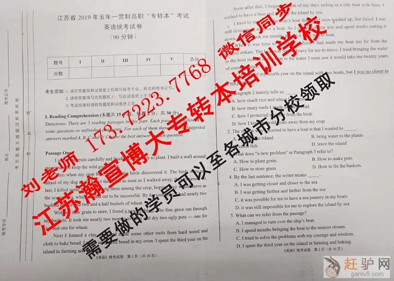江苏瀚宣博大五年制专转本2019英语真题卷限额领取,领完为止!来自www.ganlv5.com