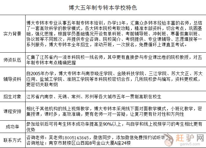 江苏瀚宣博大五年制专转本开设的五年制、三年制专转本培训学校,辅导专转本考试十几年,聚集省内长期从事五年制专转本教学的名师团队,统一安排学员住宿,实行半军事化管理,内部高强度培训,采用针对性培训材料,省时高效,通过率高达80%,小班化集训,最大程度上保证考生录取赶~驴~网。 同样是早出晚归备考,让你轻松快乐成长,南京晓庄学院大门为你敞开。具体详细联系吴老师:一八零零,五一四三64五,微信同步,添加微信免费预约试听,地址南京市鼓楼区山西路8号金山大厦A座24楼。