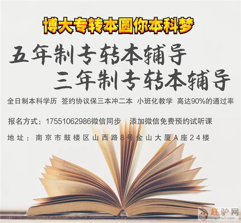 江苏博大五年制专转本学校专业从事五年制专转本辅导13年,辅导英语和各院校专业课,专业课辅导包括财务管理、秘书学、会计、旅游管理、计算机、动画、护理、药学、物流管理等专业,并与南京晓庄学院、金陵科技学院、三江学院等主考院校合作,编著权威内部教材,提前获取精准专业课考纲,编写专业课复习试卷集,为同学们转本提高通过率,具体招生详情联系招生老师 ①七五五,一〇六二,九⑧六 微信同步,添加微信免费预约试听,地址南京市鼓楼区山西路8号金山大厦A座24楼。