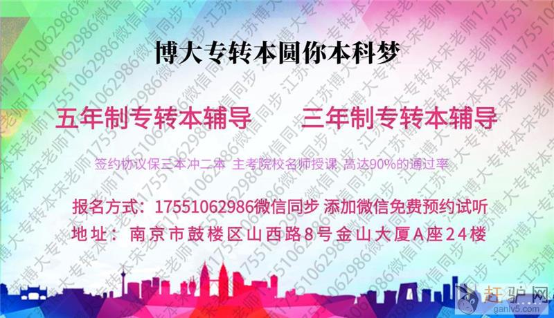 同学们想要了解更准确的专业课资料和信息可以关注江苏博大专转本学校,江苏博大专转本学校主要从事五年制专转本辅导13年,辅导江苏省统考英语和各主考院校专业课,包括财务管理、秘书学、汉语言文学、计算机、动画、护理、药学、机械设计制造及自动化、旅游管理等专业,每个报名的学员都会配备五年制专转本英语教材、对应专业课精准考纲、复习试卷集、习题册等必备资料,本着保三本冲二本的服务理念,江苏博大专转本与南京晓庄学院、金陵科技学院、三江学院等主考院校合作,编著权威内部资料,提前获取专业课考纲,且专业课都是有主考院校老师授课,帮助同学们高效复习,成功转本,具体招生详情联系 一七⑤五,一〇六二,九⑧六 微信同步,添加微信免费预约试听课,地址南京市鼓楼区山西路8号金山大厦A座24楼赶~驴~网。