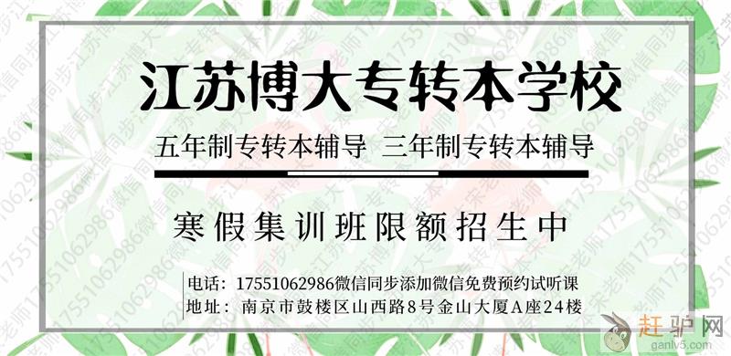 江苏博大五年制专转本学校办学13年,主要从事五年制专转本辅导,三年制专转本辅导,三年制专转本辅导英语、语文、数学、计算机,五年制专转本辅导江苏省统考英语和各主考院校专业课,包括财务管理、物流管理、旅游管理、汉语言文学、人力资源、计算机、动画、护理、药学等专业,并与南京晓庄学院、金陵科技学院、三江学院等主考院校合作,编著权威内部教学资料,专业课复习试卷集,习题册等,提前获取专业课精准考纲,提前进行专业课辅导,让同学们复习更有优势更加高效,具体招生详情联系招生老师 ①⑦五五,一〇六二,九八⑥ 微信同步,添加微信免费预约试听课,地址南京市鼓楼区山西路8号金山大厦A座24楼。