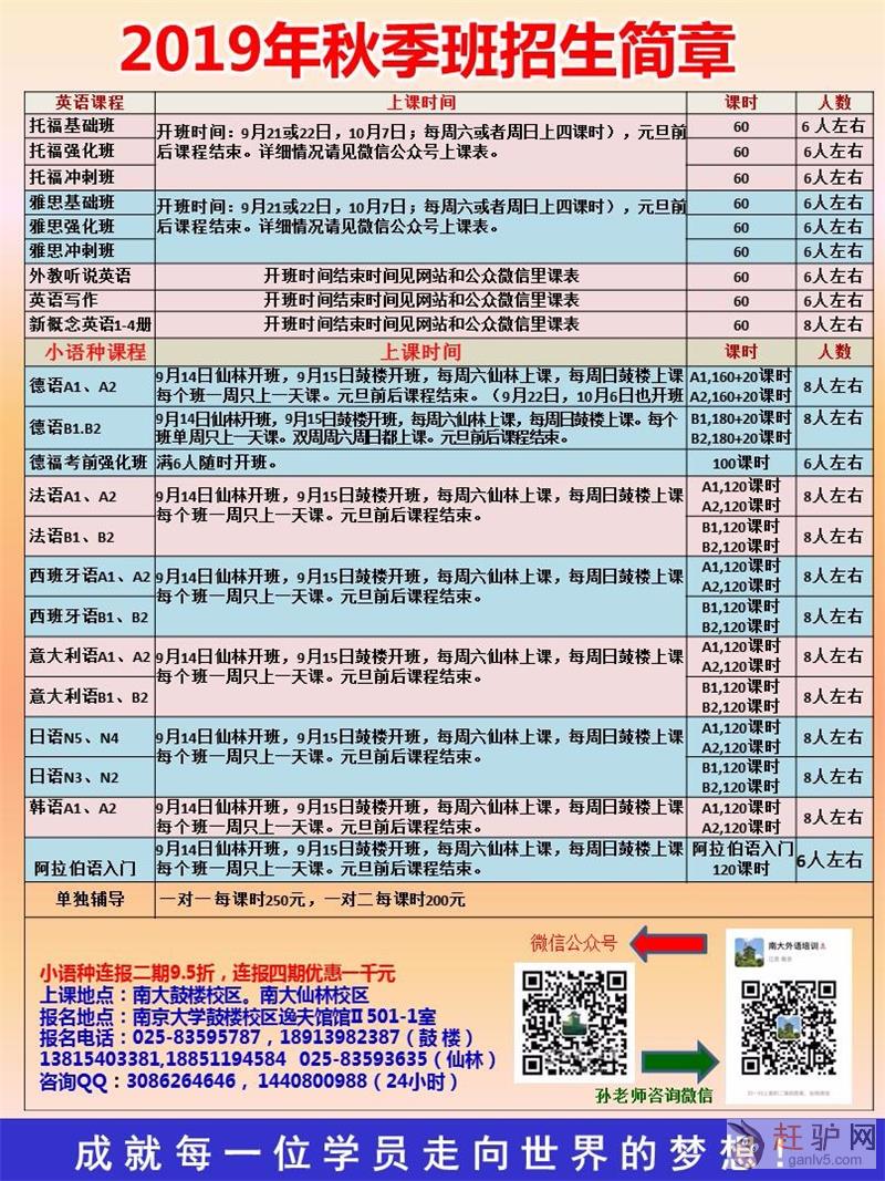 南大(蓝达)外语培训中心(原南京大学海外教育学院出国留学中心外语培训部)是依托南京大学优质外语教育资源、面向校内外学生和社会提供外语(小语种和英语)的专职外语培训机构赶~驴~网。本中心凭借一流的师资(专业外语教学专家),优质的教学环境,专业的管理团队,立竿见影的教学质量,获得历届学员与家长们的好评,广泛赢得省内外社会各界的赞誉来源www.ganlv5.com。