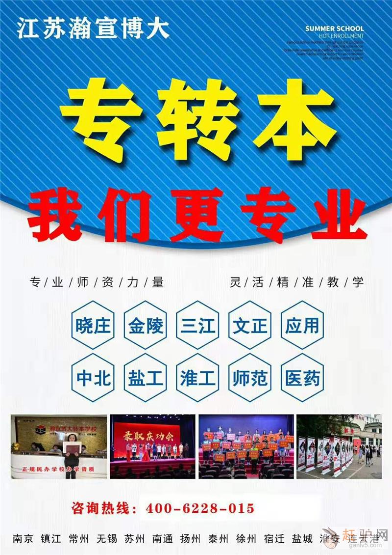 江苏瀚宣博大培训学校拥有十几年的教学经验,专业从事于专转本培训,相继在南京,镇江,常州,无锡,苏州,南通,盐城,泰州,徐州,扬州,宿迁,淮安,连云港等地招生以及开设校区。每年年培训量在一万人以上,通过率高达90%,培训中心拥有雄厚师资和办学经验专业从事培训教育,以江南大学、南京大学等高校命题组专家为核心g a n l v 5 c o m。瀚宣博大教育集团自成立以来,秉承“教育改变生活,知识改变命运,学历改变未来”的使命,一直专注于全国个性化教育,让学习更加高效,让学习充满乐趣,让人生飞得更高,是一批专业的培训团队。详情咨询武老师,一八零,零五一四,三六四五微同。